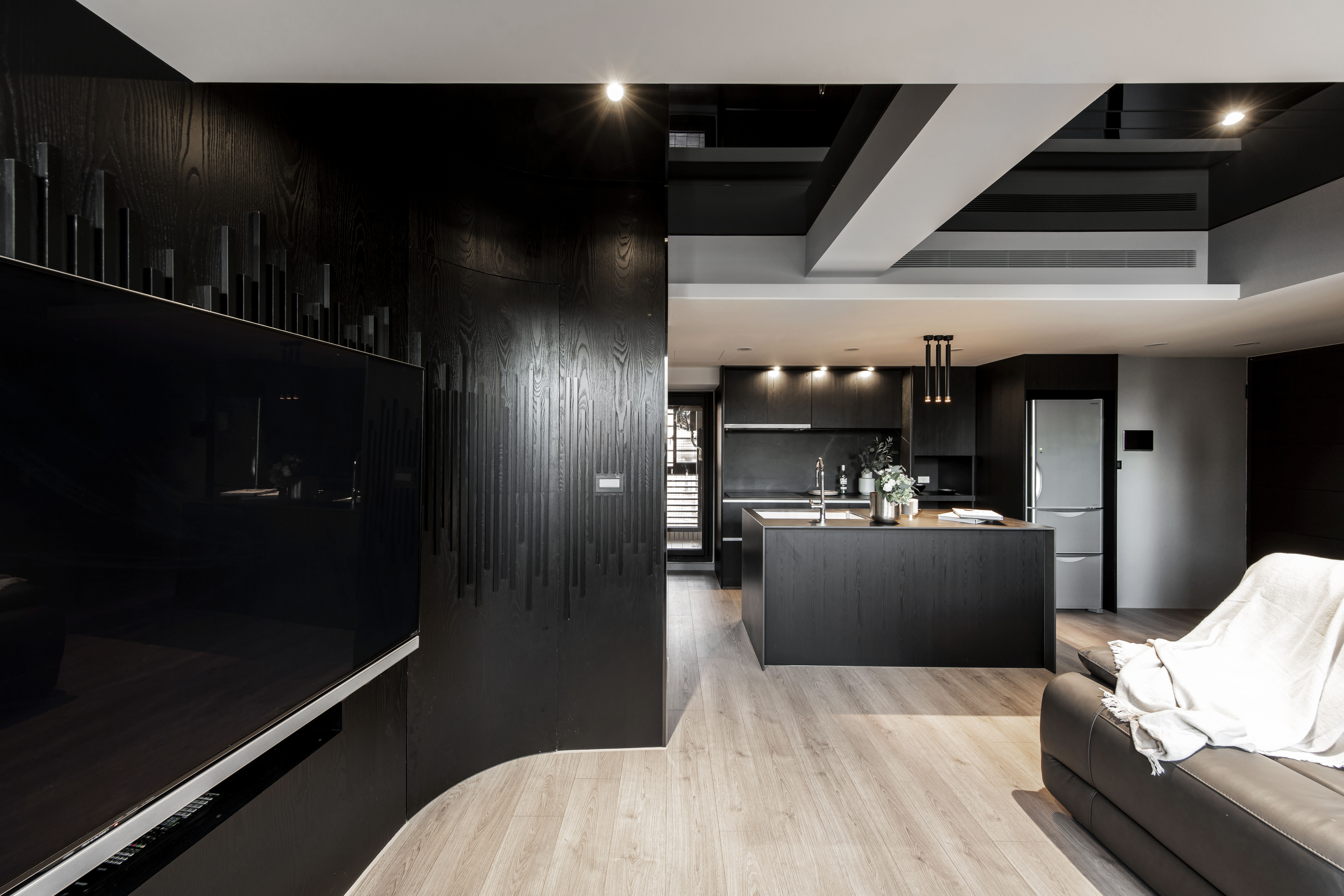 空間中的概念承襲藝術家本身對於創作的本質與之延伸,在每一光線的落腳處,運用黑色基底與彼此間的重疊、交錯,讓光能在每一處的設計與裝潢間來回流動,在深黑色線條的肌理中透出光芒,形塑成一種有力的結構,進而衍生出空間裡黑色與光相互存在的律動感。